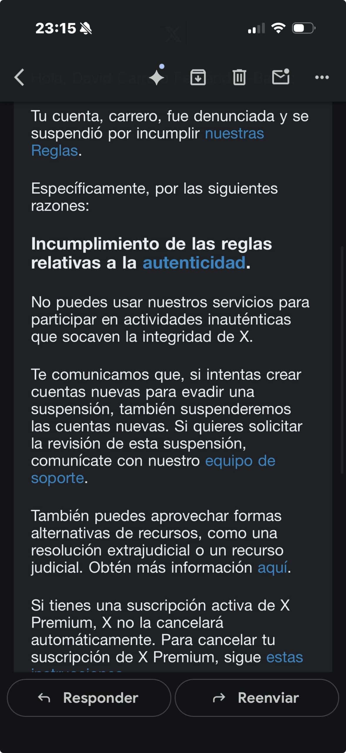 Hoy me he encontrado con una situación tan absurda como preocupante: X (antes Twitter) ha suspendido mi cuenta personal @carrero por presunto “incumplimiento de las reglas relativas a la autenticidad”. Soy suscriptor Premium, llevo años usando esa cuenta para comunicarme a nivel personal y profesional, y puedo acreditar mi identidad sin ningún problema. Adjunto la captura que me ha enviado la propia plataforma para documentar el caso.